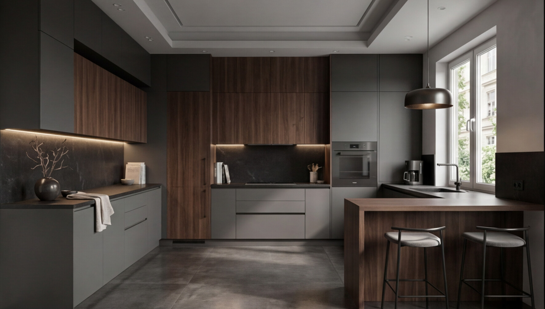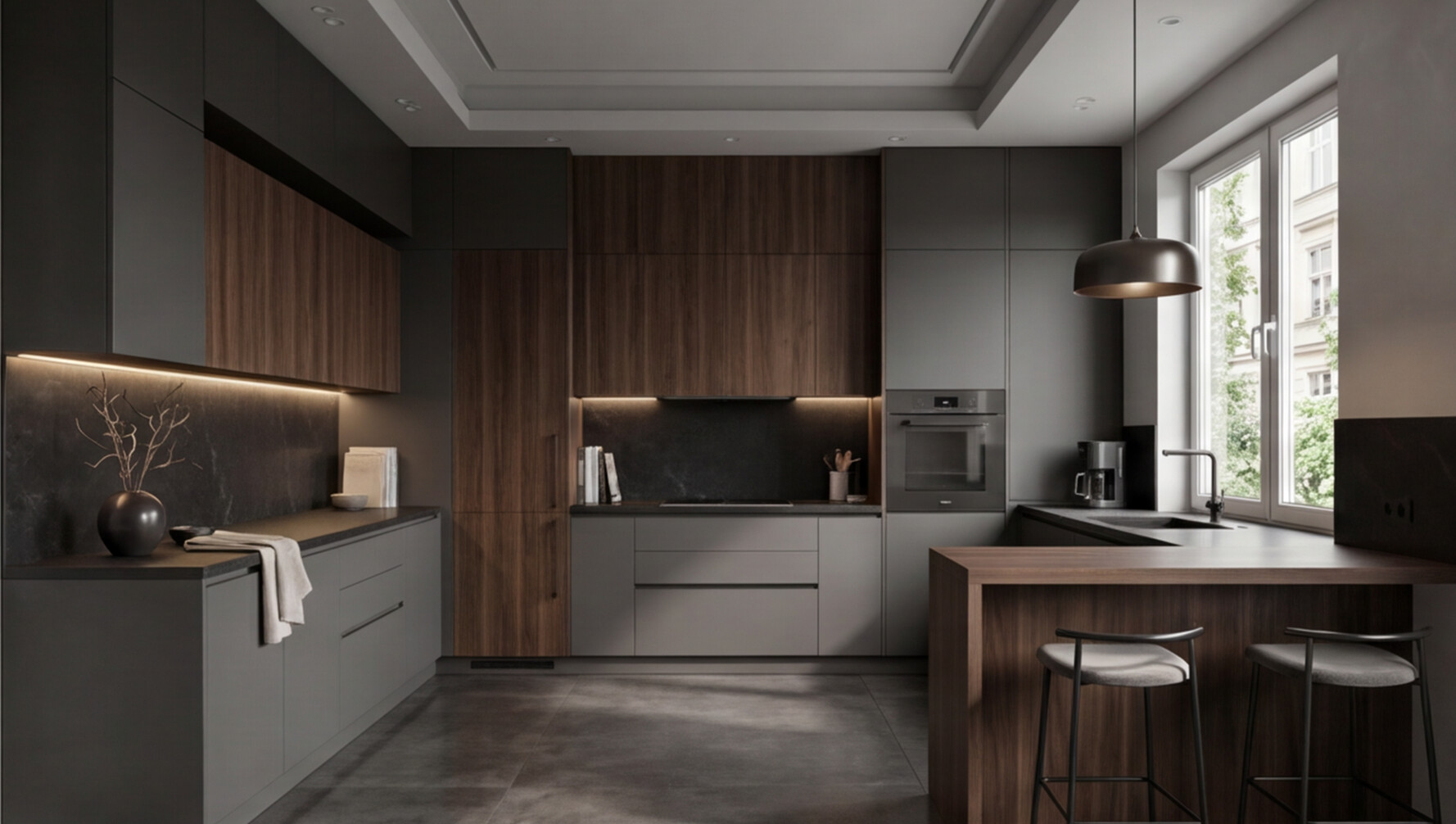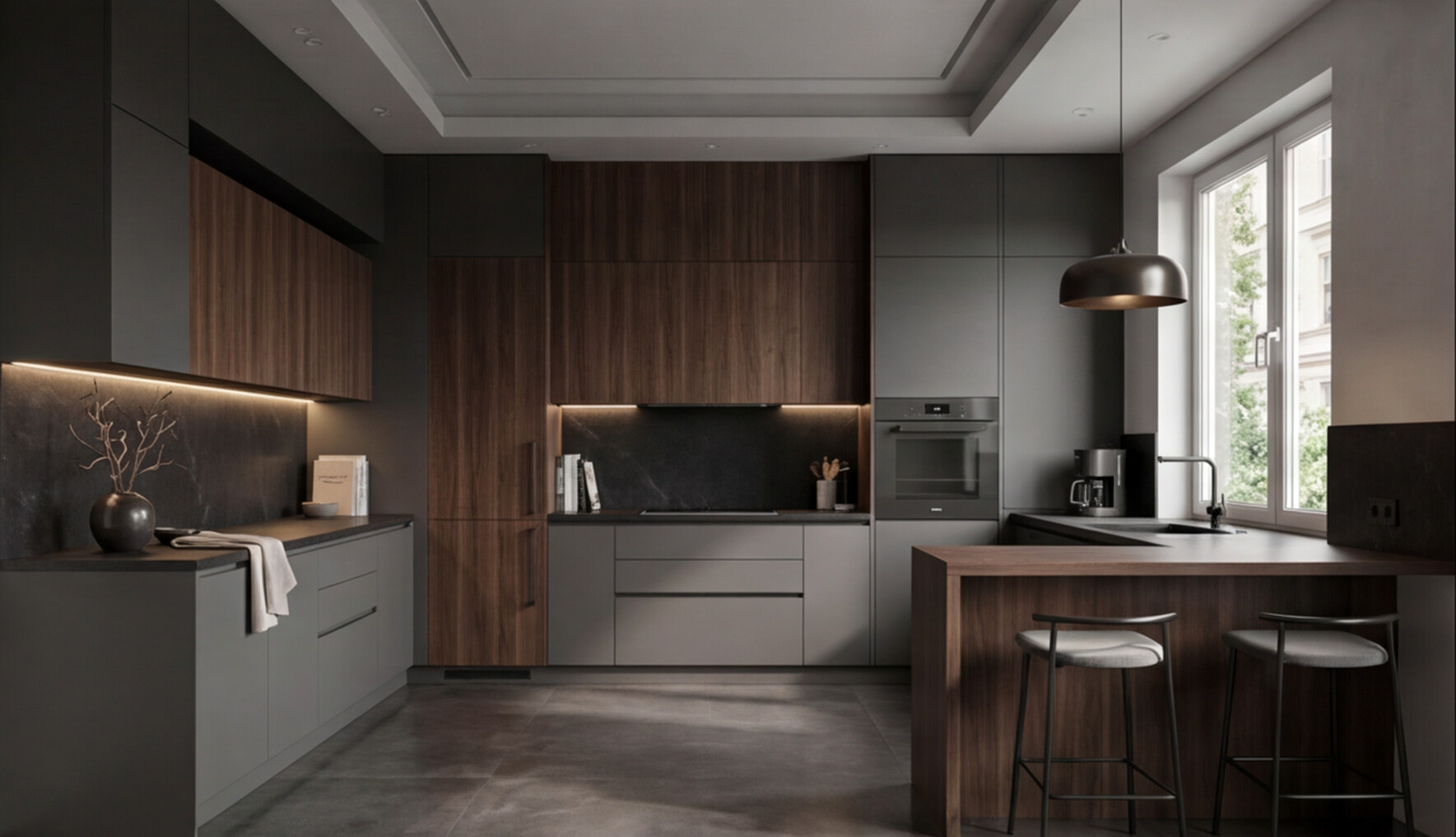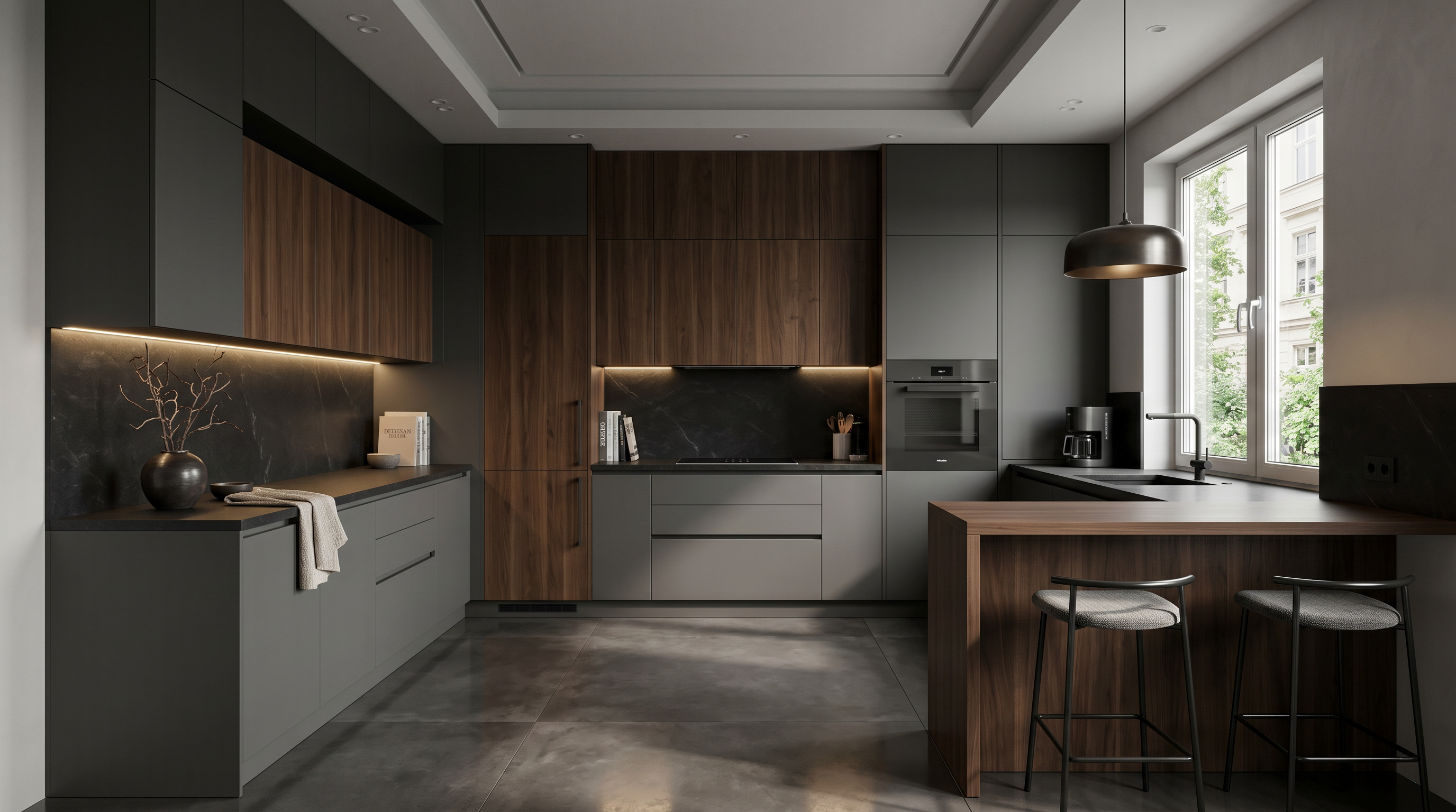 Такой формат особенно актуален для современных квартир и частных домов, где кухня становится не просто технической зоной, а важной частью общего дизайнерского пространства. Матовые графитовые фасады создают глубокий, благородный характер интерьера, формируя строгую современную эстетику с акцентом на статус и визуальную монолитность. Панели под темный орех добавляют композиции натуральную теплоту древесины, создавая выразительный баланс между строгой геометрией и уютной премиальностью.