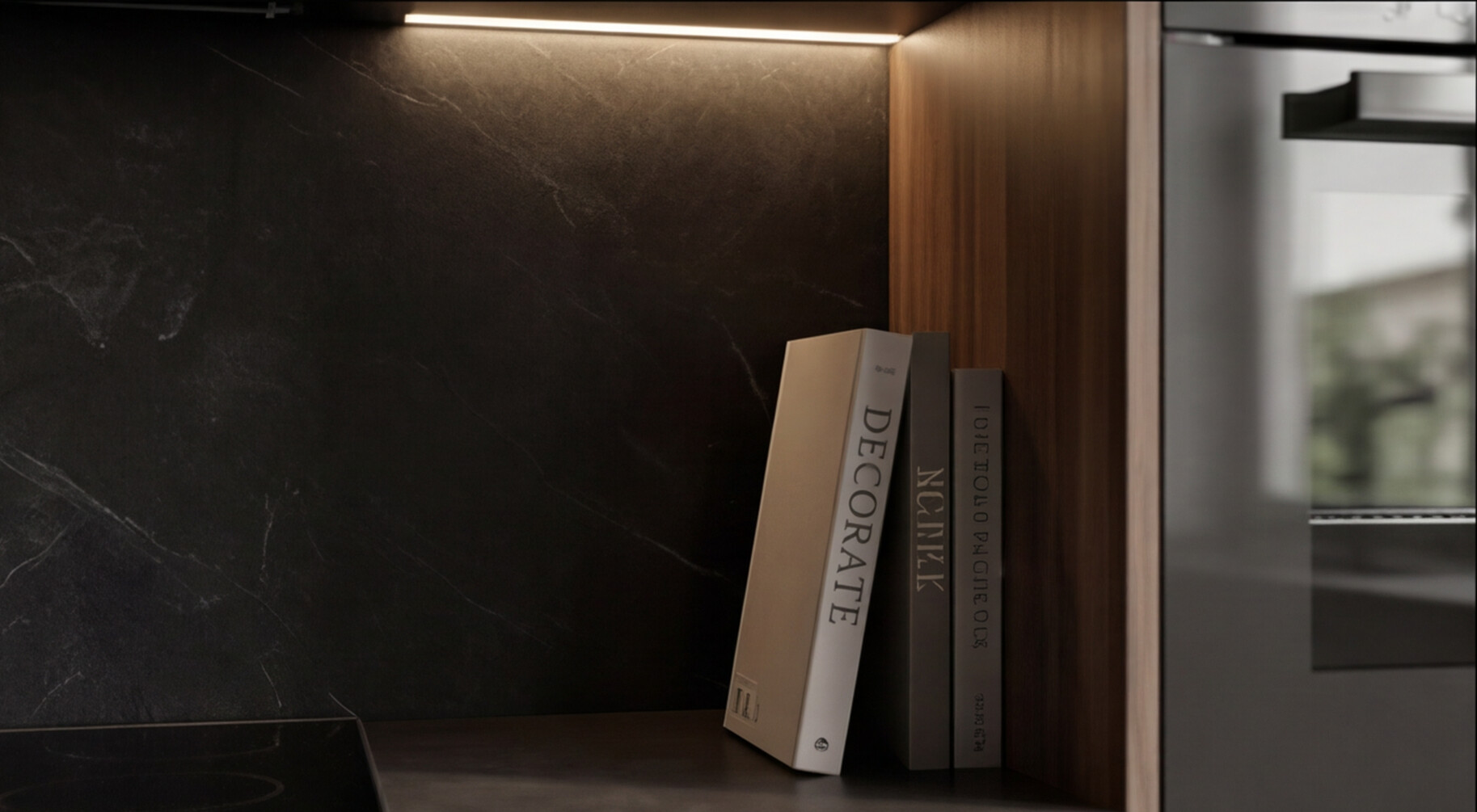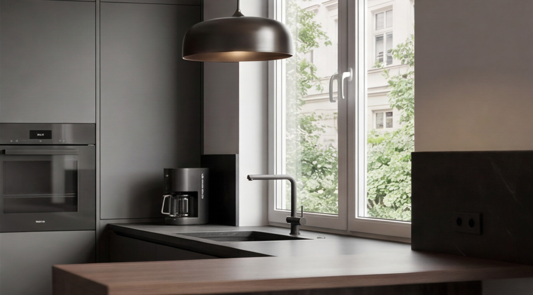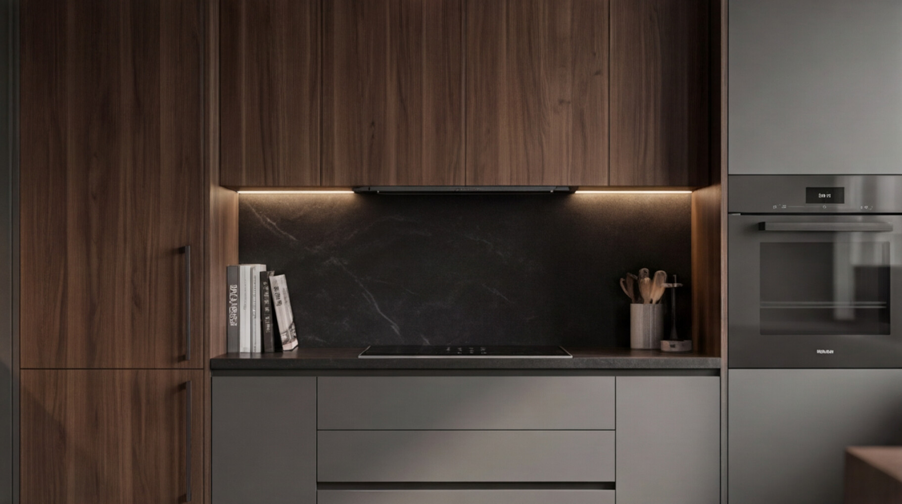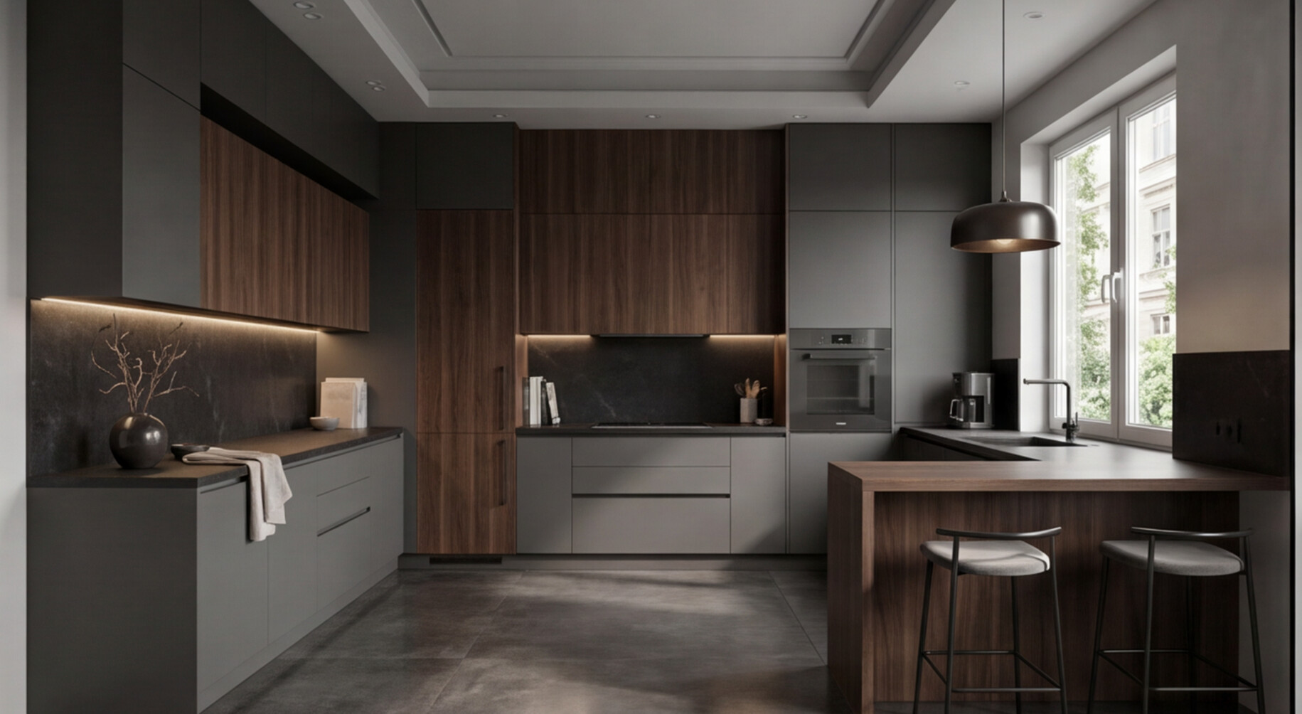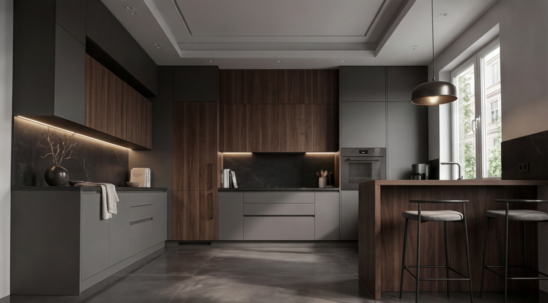 Такой формат особенно актуален для современных квартир и частных домов, где кухня становится не просто технической зоной, а важной частью общего дизайнерского пространства. Матовые графитовые фасады создают глубокий, благородный характер интерьера, формируя строгую современную эстетику с акцентом на статус и визуальную монолитность. Панели под темный орех добавляют композиции натуральную теплоту древесины, создавая выразительный баланс между строгой геометрией и уютной премиальностью.