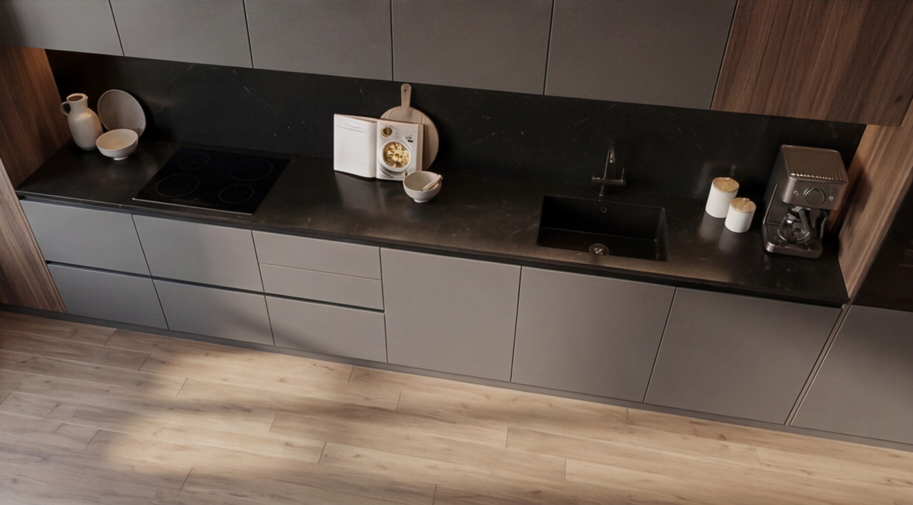Линейная компоновка длиной 3 метра обеспечивает комфортную рабочую зону, позволяя гармонично разместить все ключевые функциональные элементы: зону хранения, встроенную технику, рабочую поверхность и акцентный высокий пенал для техники.