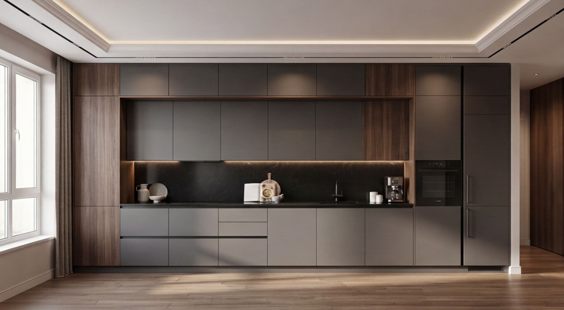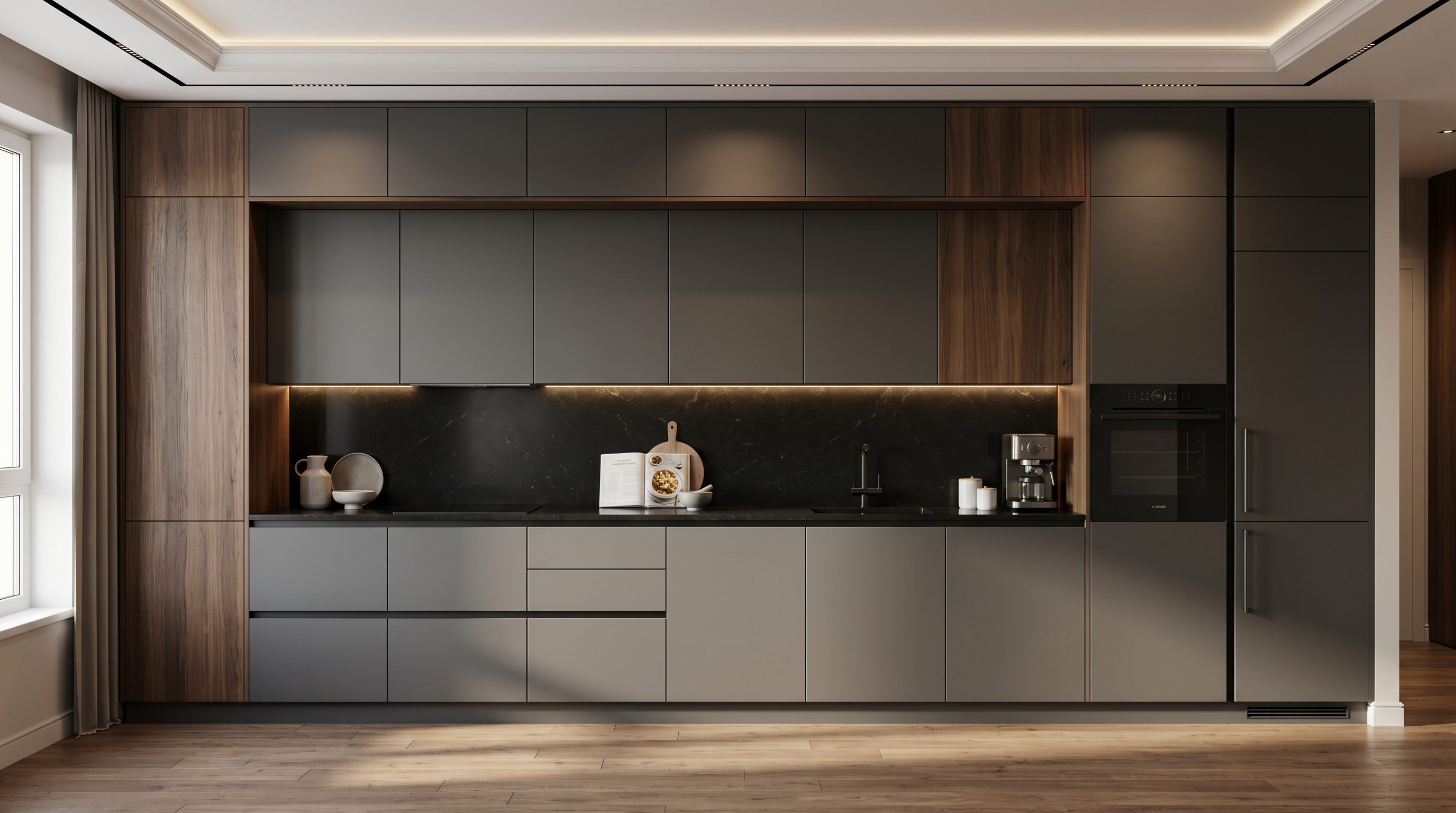 Матовые графитовые фасады создают глубокий благородный характер интерьера, подчеркивая статусность пространства, а панели под темный орех добавляют композиции теплоту натуральной текстуры и визуальную глубину. Черная каменная столешница усиливает ощущение монолитности и дорогого исполнения, формируя цельный современный образ.