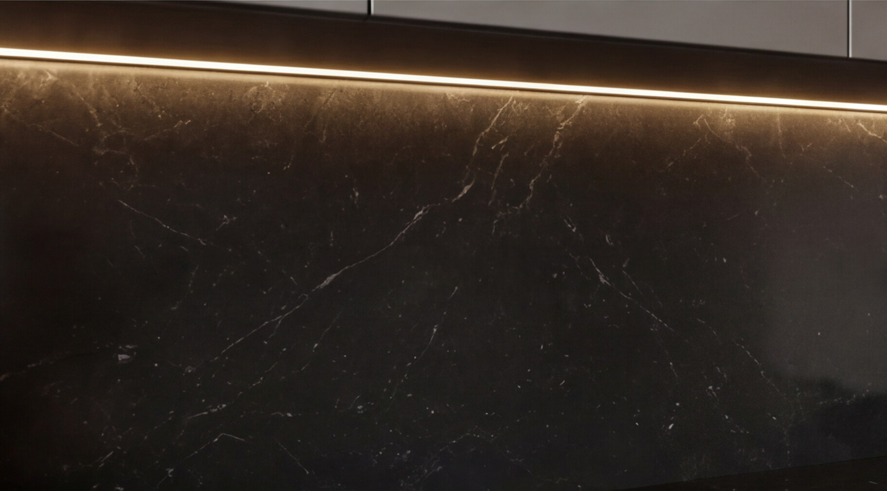 Интегрированная LED-подсветка под верхними модулями делает пространство более выразительным, добавляя мягкое функциональное освещение и подчеркивая архитектуру кухни. Скрытые системы открывания, встроенная техника и четкая геометрия фасадов создают минималистичную эстетику без лишних деталей.