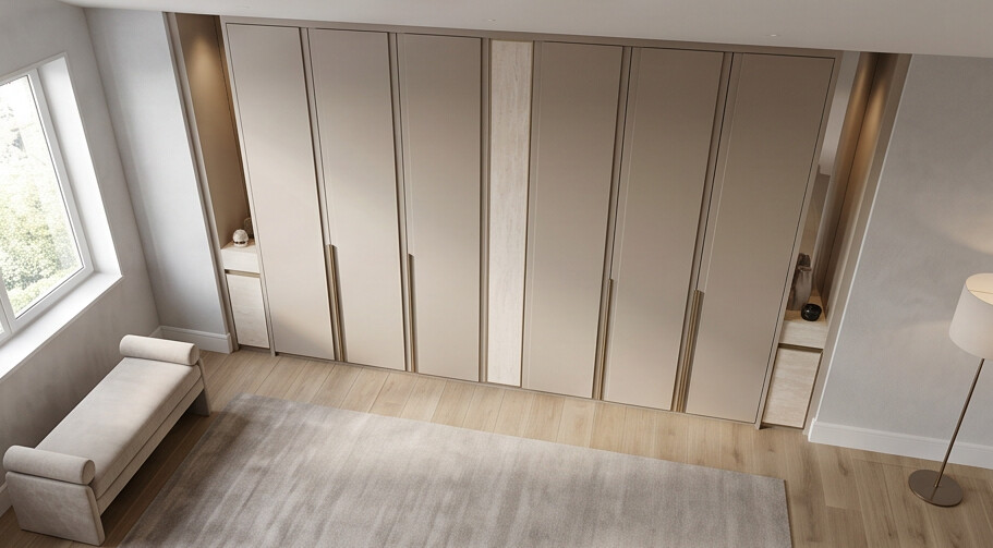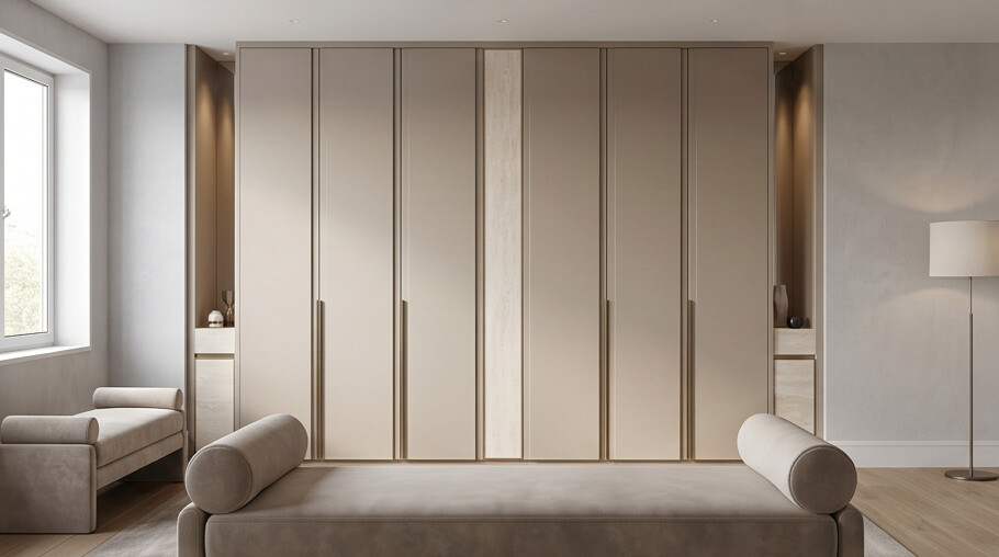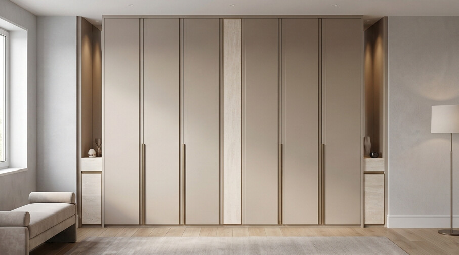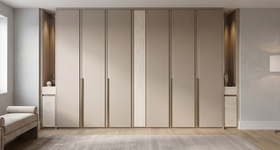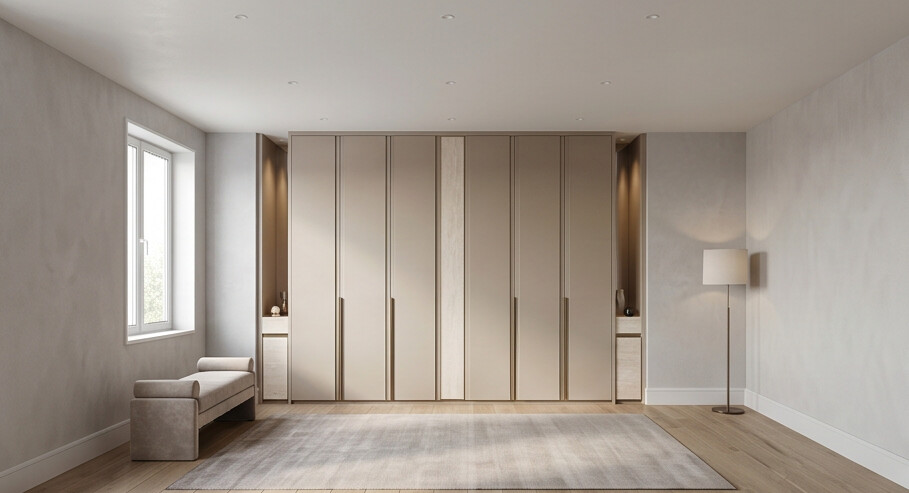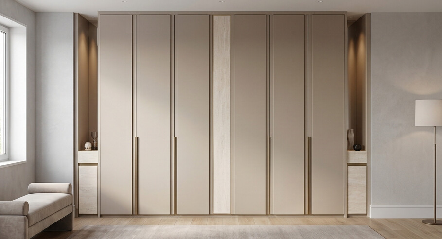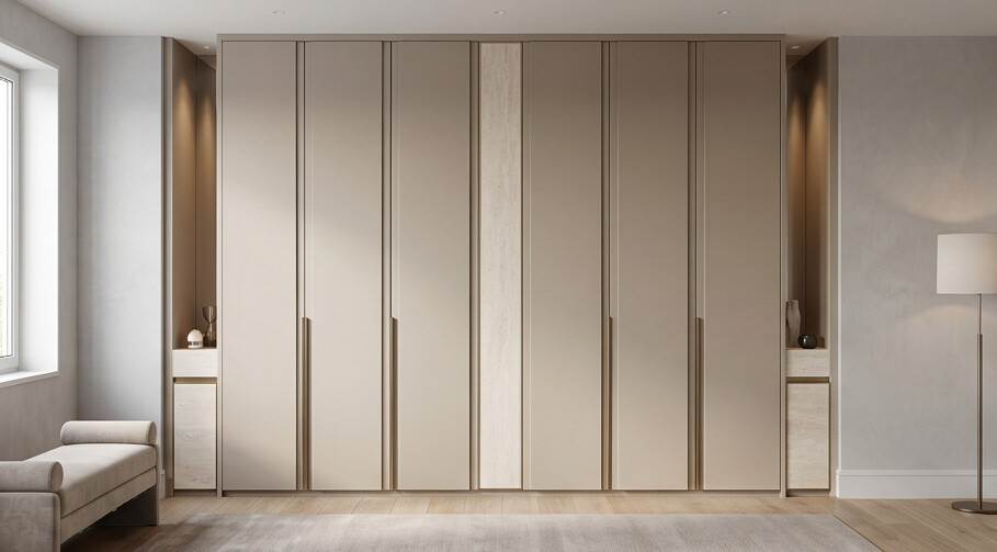 Просторный распашной шкаф 3 м в теплой бежевой гамме: матовые фасады, светлые каменные акценты, латунные детали и утонченный премиальный дизайн для элегантного интерьера.