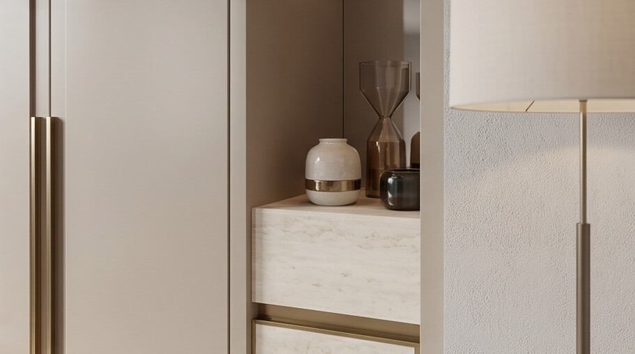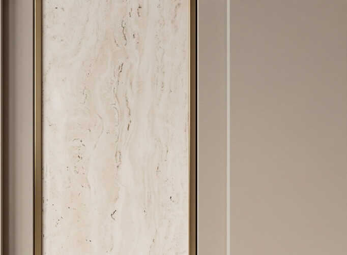 Латунные детали выступают тонким акцентом роскоши, добавляя интерьеру утонченность без излишней декоративности. Благодаря сбалансированной вертикальной композиции и четкой геометрии фасадов шкаф выглядит монолитно, элегантно и визуально дорого, органично вписываясь как в contemporary luxury, так и в мягкие modern classic интерьеры.